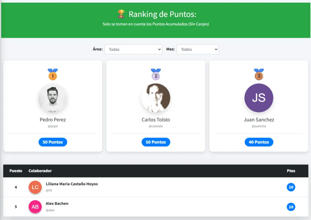 La sección “Ranking de Puntos” permite reconocer de forma clara y motivadora a los colaboradores con mayor puntaje dentro de la organización. Presenta un podio para los tres primeros lugares (al estilo de las competencias deportivas) y una tabla para los puestos restantes, facilitando ver quiénes destacan, incentivar la participación y fomentar una competencia sana. Además, permite consultar el progreso por mes, por área o de manera total.